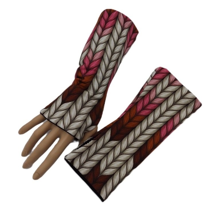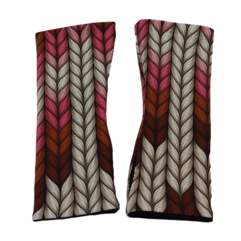 Außen wurde bei diesen Armstulpen ein wunderschöner French Terry mit Zopfstrick-Print in rosa, beige und braun vernäht. Innen wurde uni schwarzer Jersey kombiniert.