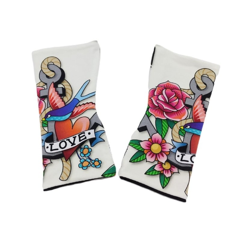 Der Sweat zeigt ein buntes Design im Tattoo-Stil mit einem Anker, einer Schwalbe und Blumen. Die kräftigen Farben setzen sich wunderbar vom cremefarbenen Untergrund ab. Gefüttert sind die Armstulpen schlicht in schwarz.